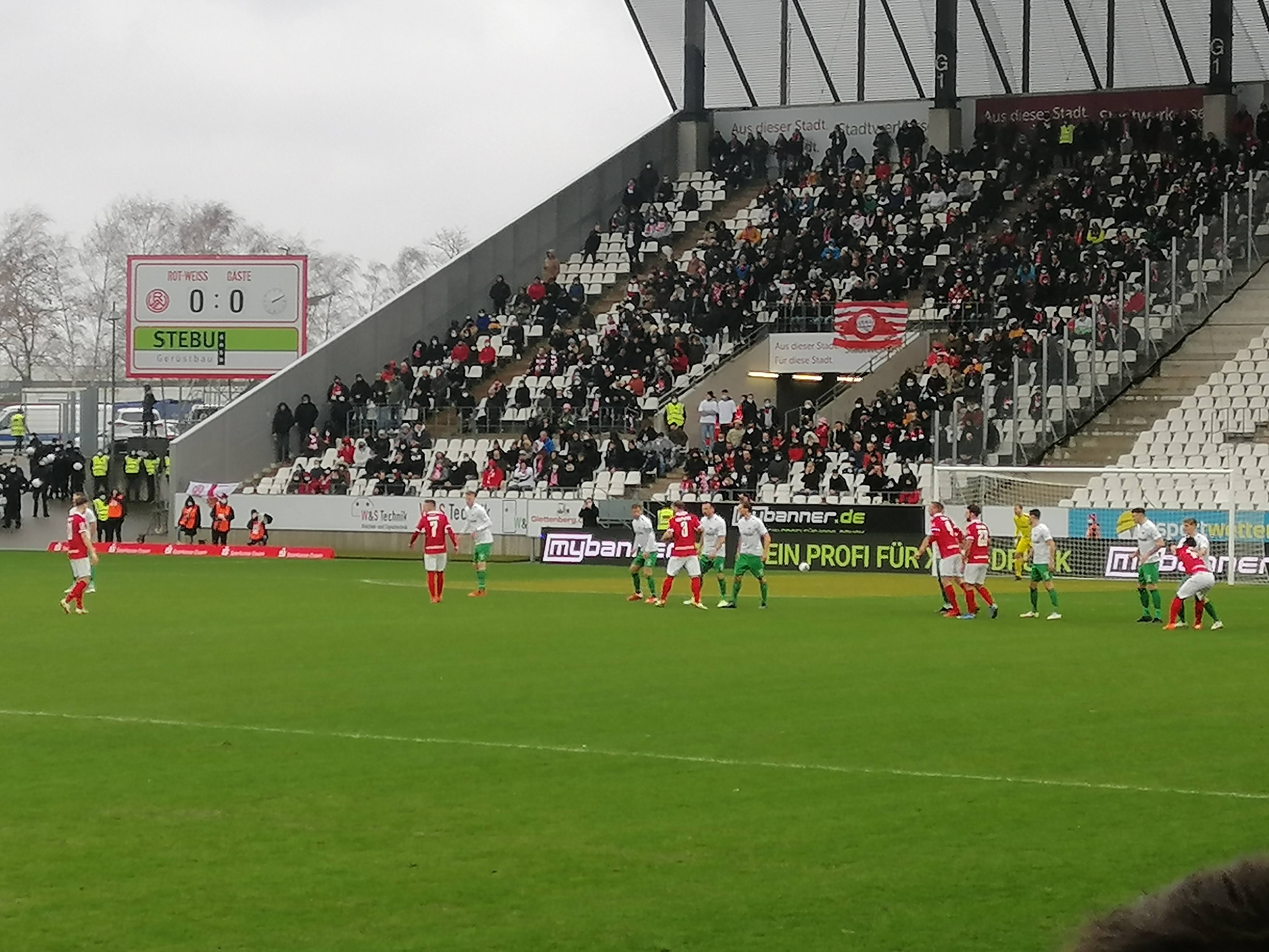 Na een paar opwarmers binnen Nederland werd het tijd om ook weer eens over de grens te gaan kijken. Zoveel heb ik dat nog niet gedaan dus de wensenlijst is lang. De zondag 20 februari moest het maar weer eens gebeuren, de Futbology app werd er bij genomen het zoeken was begonnen. Gezien de aanvangstijd van de wedstrijd en de reistijd viel het oog op Rot Weiss Essen in Duitsland. Essen ligt op een kleine 1,5 uur rijden van mijn woonplaats dus dat was goed te doen. Deze dag zou koploper Rot Weiss Essen nummer 2 uit de Regionalliga West competitie Preußen Munster op bezoek krijgen. Door de laatste versoepelingen in Duitsland zouden er maximaal 10.000 man mogen komen. Nu was het zaak om een kaartje te bemachtigen voor deze wedstrijd. Toen de voorverkoop startte was er een wachtrij op de site om een kaartje te kopen, eenmaal voorbij de wachtrij was er toch nog genoeg mogelijkheden voor het aanschaffen van een kaartje. Nadeel van het kopen van een kaartje is dat ze deze alleen aangetekend per post versturen, ze werken dus niet met e-tickets. Het aangetekend versturen naar Nederland kost € 7,60, zonde op zich, maar aan de andere kant, ik heb nu wel weer eens een origineel kaartje. Het was nu alleen zaak dat het kaartje natuurlijk ook wel daadwerkelijk binnen zou komen en het liefst ook nog een beetje op tijd. Gelukkig kwam het kaartje de donderdag voor de wedstrijd netjes binnen en was het eerste stressmomentje voorbij.